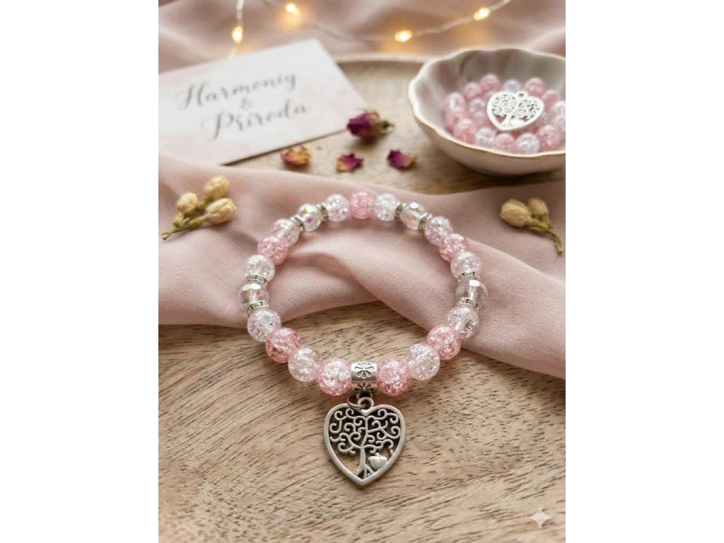 Náramek z růžového praskaného křišťálu doplňuje jemný přívěsek strom života zasazený v srdíčku.